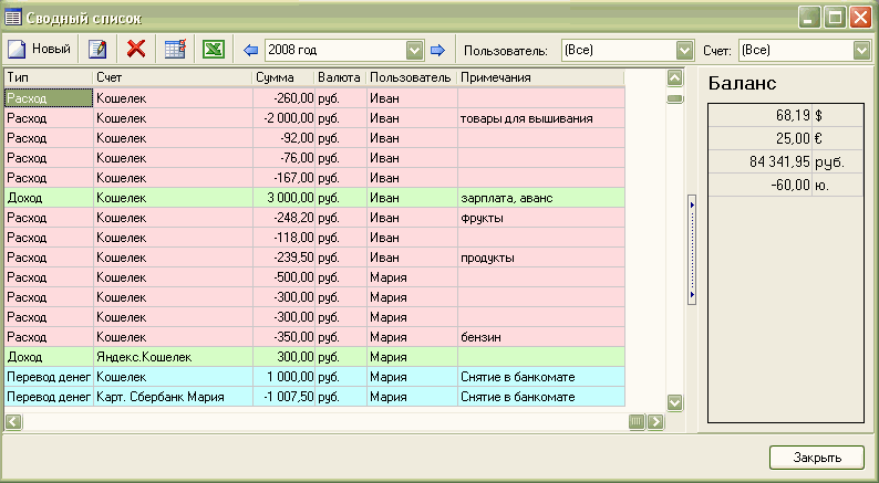 Для тех пользователей, которые привыкли видеть расходы «построчно/постатейно», в программе специально сделан список «Доходы/расходы детально», который позволяет увидеть все доходы и расходы в традиционном виде, то есть для приведенного выше примера в этом списке появятся 20-30 строчек расходов. В этом списке удобно искать покупки и платежи, например, чтобы узнать, когда Вы последний раз платили за сотовый телефон, достаточно отсортировать данные по названию статьи, по алфавиту дойти до наименования «Сотовый телефон» и увидеть все платежи за сотовый телефон. Конечно, эту информацию в наглядном виде можно также получить с помощью отчетов.